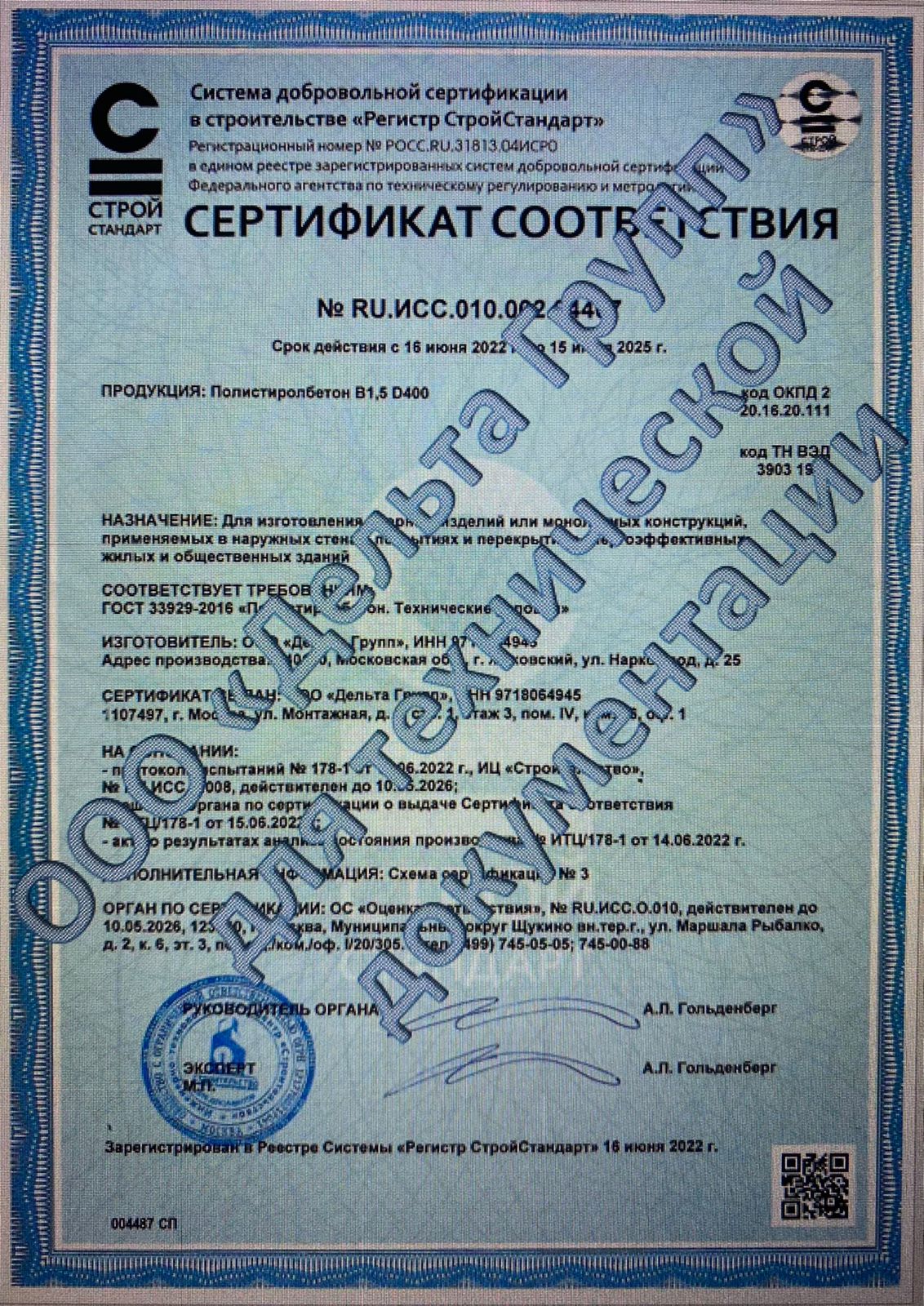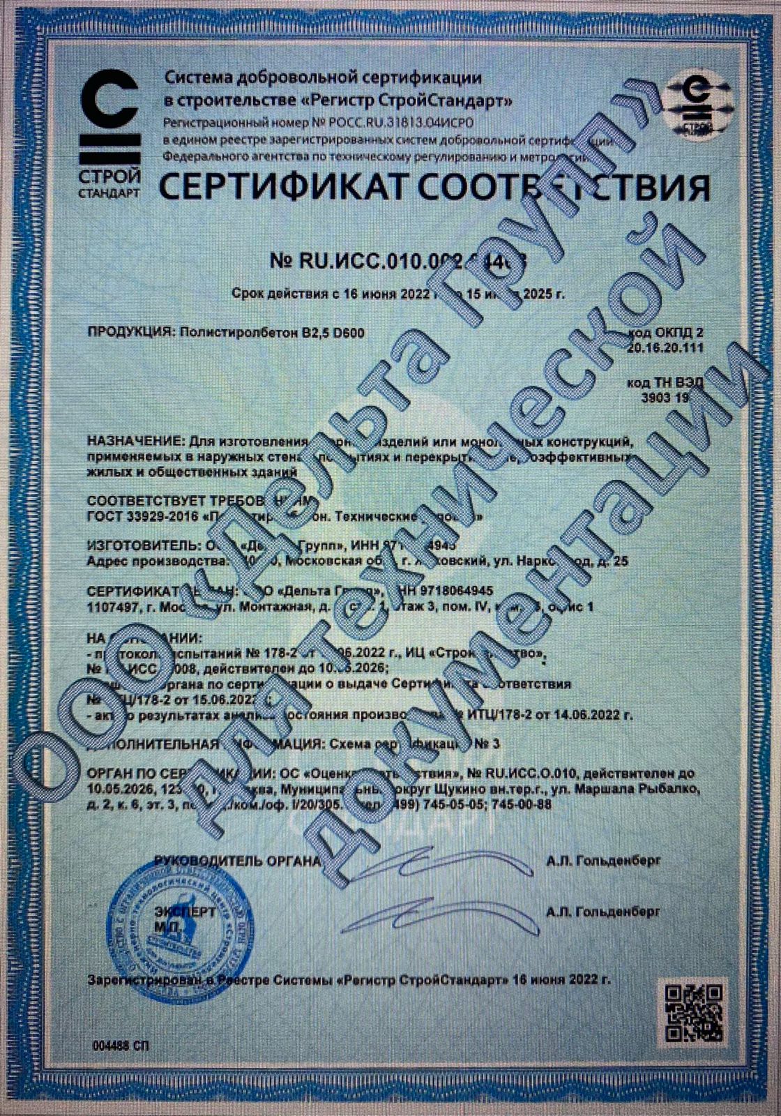 Наши стеновые панели и плиты перекрытия из полистиролбетона имеют сертификаты со стандартами ГОСТ 33929-2016!