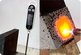 На протяжении 30 минут с помощью газовой горелки, направленным пламенем температурой примерно 1200 градусов, производился нагрев куба из полистиролбетона с установленным температурным датчиком в 6 см от края нагреваемой поверхности. Испытание показывают стойкость полистиролбетона к высоким температурам.
